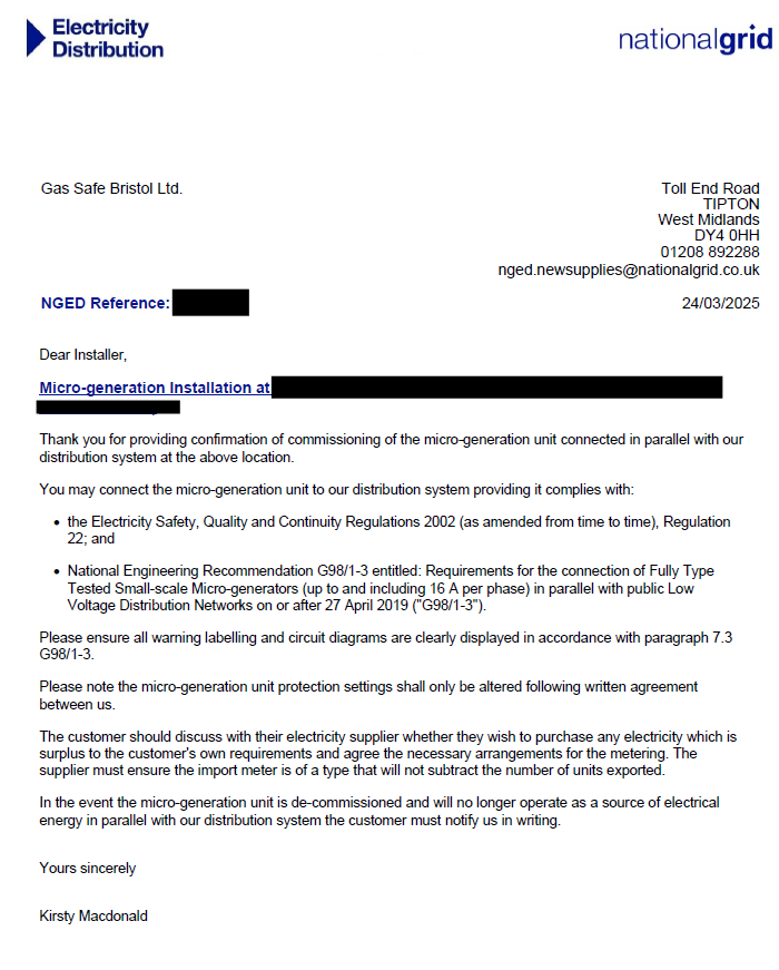 Your installer should supply you with a proof of grid connection letter, also called a “DNO G98” letter, as part of the handover process after they’ve installed your solar panels. If your installer is registered with MCS and they don’t provide you with this letter, you can complain to MCS.