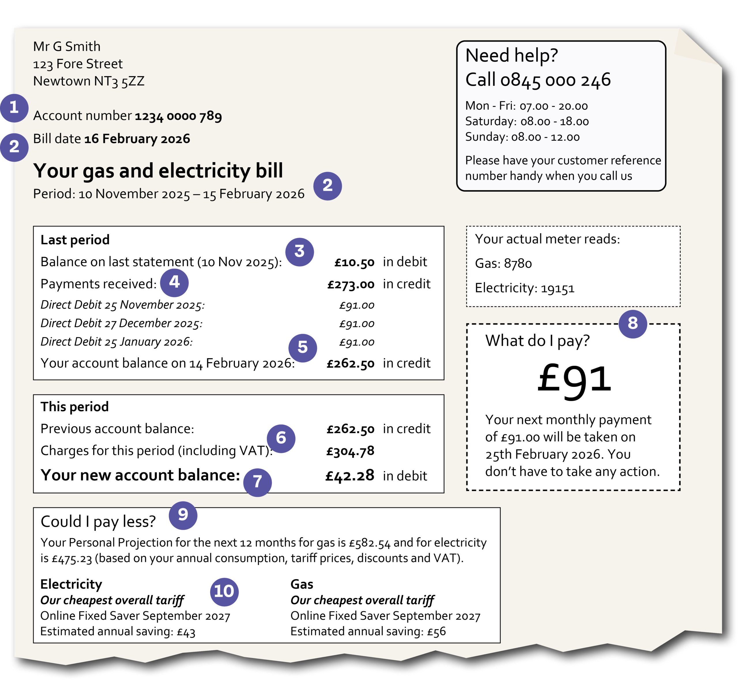 4 Payments received. This records the payments you’ve made since the last bill or statement. If it’s a bill, your payment(s) to pay off the last bill should be recorded here. If it’s a statement, you should see all your monthly direct debits or your top ups. Contact your supplier if any of these payments are.