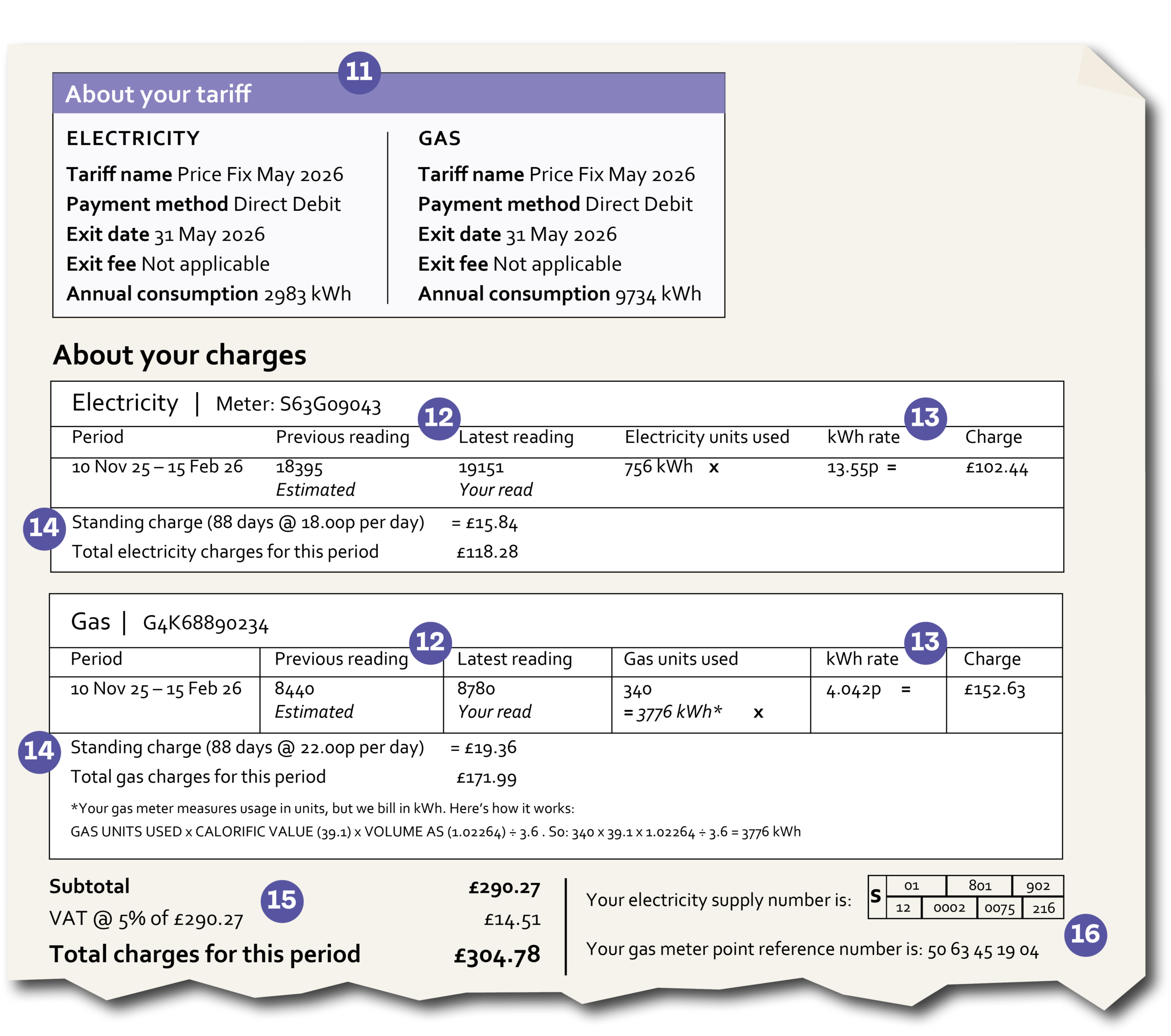 6 Charges for this period (including VAT). This records the total costs incurred of all the gas and/or electricity used within this billing period. To see more about how this is calculated see sections 13-15 below.